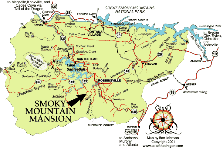 - Scenic Road Tours - Drive the Cherohala Skyway for some of the most scenic views in the entire Appalachians. For those seeking more excitement, try the Tail of the Dragon with 318 curves in 11 miles on US 129. Only an hour distant is the southern beginning of the Blue Ridge Parkway at Cherokee, North Carolina. The scenic route on US 64 from Franklin to Cashiers attracts many visitors each year, especially during the fall colors.